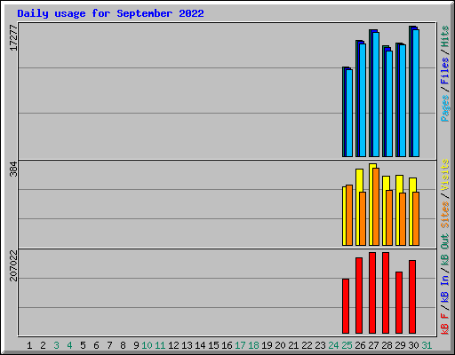 | Day | Hits | Files | Pages | Visits | Sites | kB F | kB In | kB Out | ||||||||
